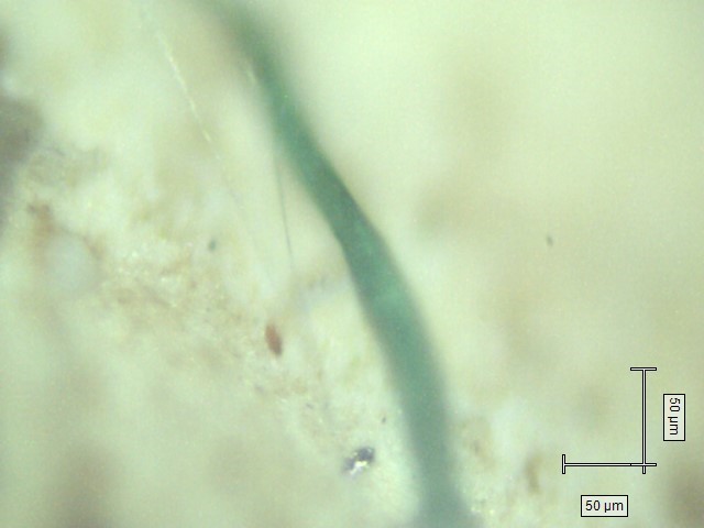 | Sample description | The mask is primarily made from blue (outer side) and white (inner side) polypropylene fibers. |
